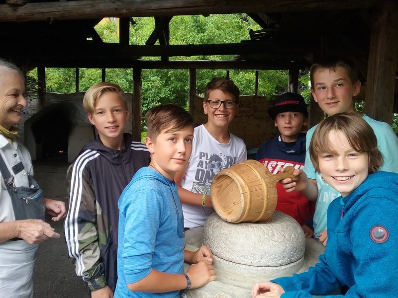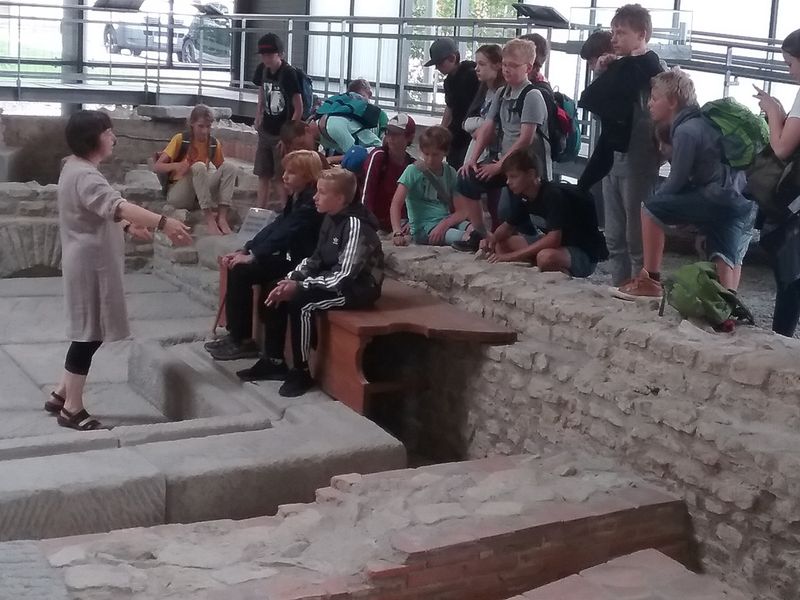 Am 02.07.2019 fuhr die Lateingruppe von Frau Ober (6a, 6b) zum Archäologischen Park in Kempten. Auch die Gruppe von Herrn Kulzer (6c, 6d) war mit an Bord. Am Vormittag besuchte Frau Obers Gruppe das Projekt „Brotbacken“. Die andere Gruppe nahm an dem Projekt „Schreiben in der Antike“ teil.Als erstes durften wir verschiedene Körnerarten erraten und angeben, welche man zum Brotbacken nehmen konnte. Anschließend durften wir unseren Brotteig formen und verschiedene Geräte ausprobieren, welche inder damaligen Zeit zum Körnermahlen benutzt wurden. Nachdem jeder Brotteig in Form gebracht war, wurde dieser in einen alten Ofen geschoben. Während der Teig buk, nahmen wir an einer Führung durch den Archäologischen Park teil.