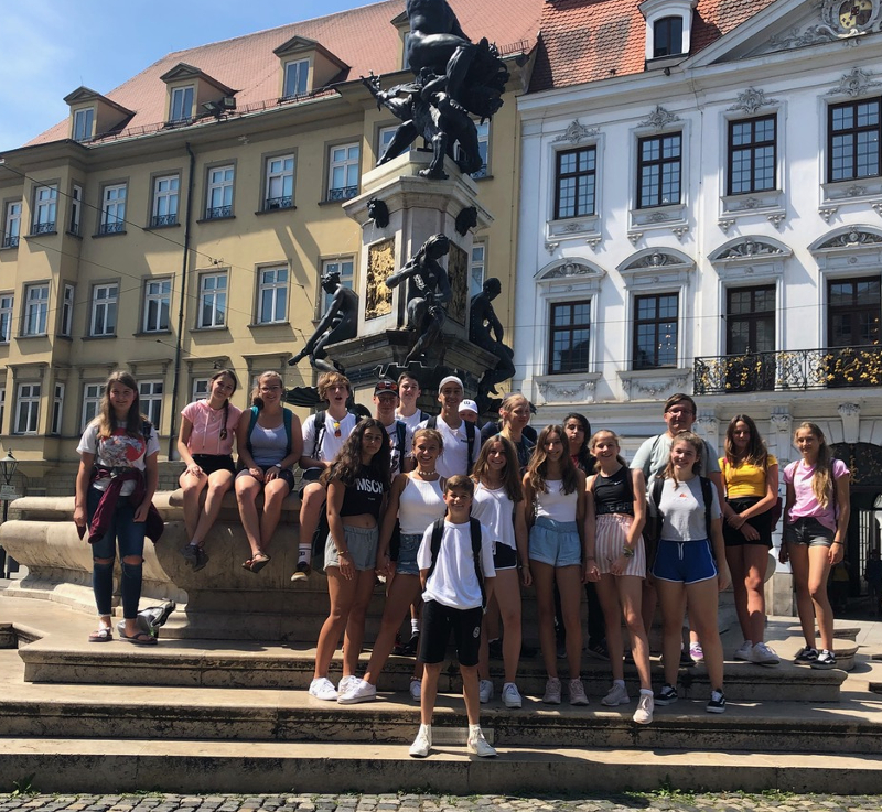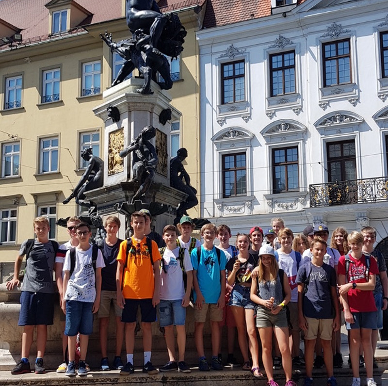 Die jeweils andere Gruppe erkundete die Augsburger Innenstadt mit den drei Prachtbrunnen (mit mythologischen Motiven) und besichtigte den Augsburger Dom. Nach einem gemeinsamen Picknick im idyllischen Park des Schaetzlerpalais bummelten die Schüler noch selbstständig durch die Innenstadt, bevor an diesem sonnigen vorletzten Schultag uns der Bus wieder zurück nach Garmisch-Partenkirchen brachte.
