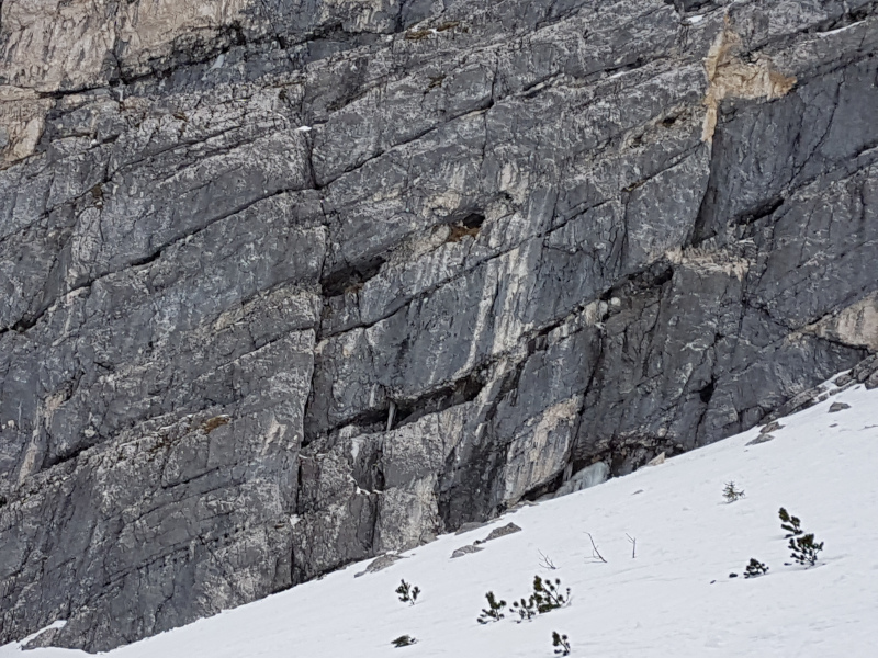 Wir starteten am Dienstag Nachmittag am Alpspix zu unserer genialen Spezial-Geologie-Exkursion. Dort erklärte uns Herr Neumann das ehemalige Bergbaugelände und die dazugehörigen Knappenhäuser im Höllental. Die meist geförderten Bodenschätze waren damals Eisen, Zinn, Blei und Molybdän. Die Knappenhäuser heißen übrigens wegen der Knappen, also den Bergleuten, so, wie sie heißen. Die Hauptgesteinsform im Gebirge zwischen der Partenkirchner Dreitorspitze und der Zugspitze ist der stark verdichtete Wettersteinkalk. Durch die glaziale Erosion in den vergangenen Eiszeiten wurde er so bearbeitet und abgeräumt, wie er heute vorzufinden ist. In den Gipfelbereichen und Karen befanden sich übrigens um 1850 auch noch einige kleine Gletscher. Die vielen Rillen, Platten und Kamine im Fels, welche traumhaft zum Klettern sind, wurden durch die glaziale Erosion in Kombination mit der Verwitterung durch Kalklösung hervorgerufen.Nach einer kurzen Skiabfahrt an den Fuß der Bernadeinwand konnten wir die markanten Schichtungen im Gestein verfolgen, welche sich vom Gipfel der Alpspitze über die Wand des Bernadeinkopfes bis zum Stuiben herabziehen. Das dort vorzufindende Kalkgestein ist wasserlöslich und porös, wodurch es auch wasserdurchlässig ist. Aufgrund dieser Eigenschaften der Wand konnten wir das „Gsicht“ sogar mit Zahn sehen (vgl. Bild!).