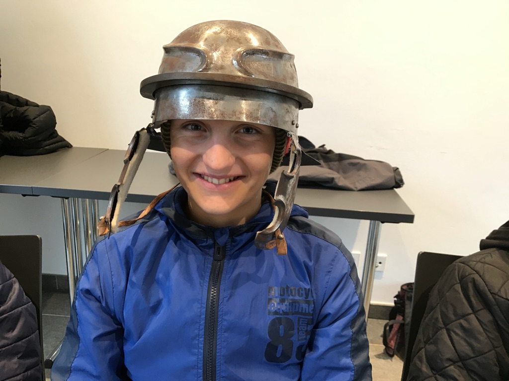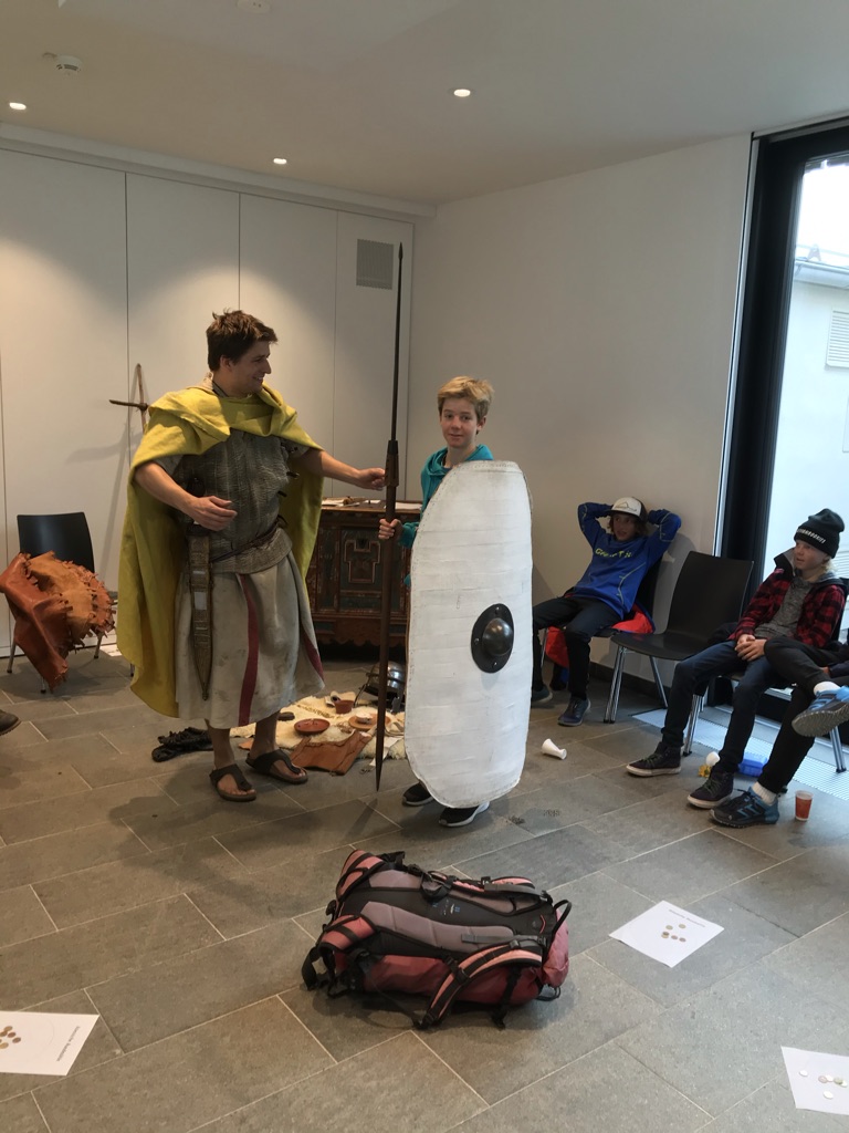 Uns wurde gezeigt, mit welchem Instrument man in der antiken Zeit gerade Straßen baute, und wir konnten Gegenstände wie Hufeisen, Münzen, Schwert, Speer, Tragerucksack, Nagelschuhe, Schild und Helme in die Hände nehmen. Das römische Spiel „Kreismühle“ hat uns Spaß gemacht. Wir danken dem Organisator der „Römischen Wochen“, unserer Lehrerin Frau Ober und dem Führer Reinhard für diesen gelungenen Ausflug.