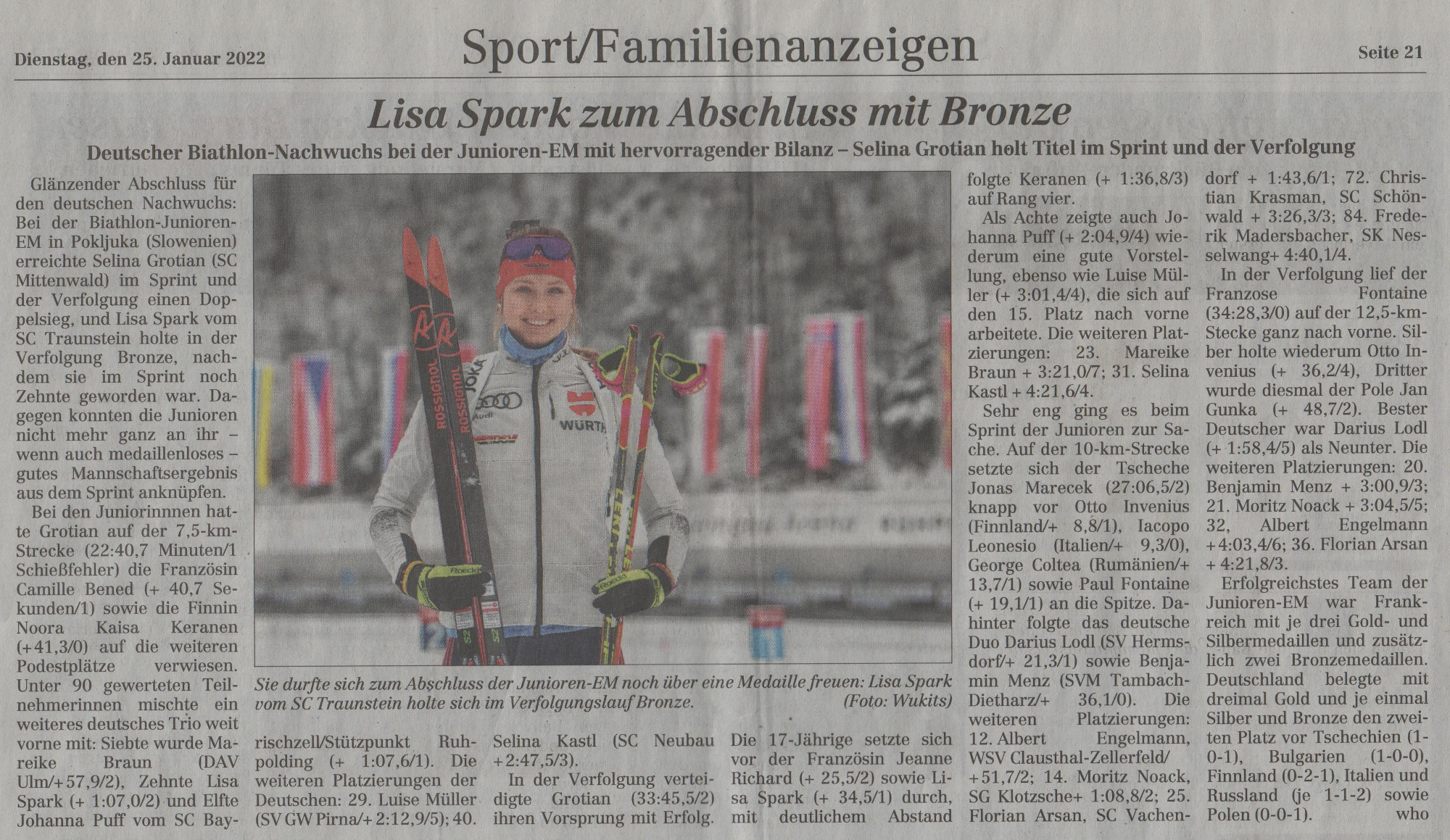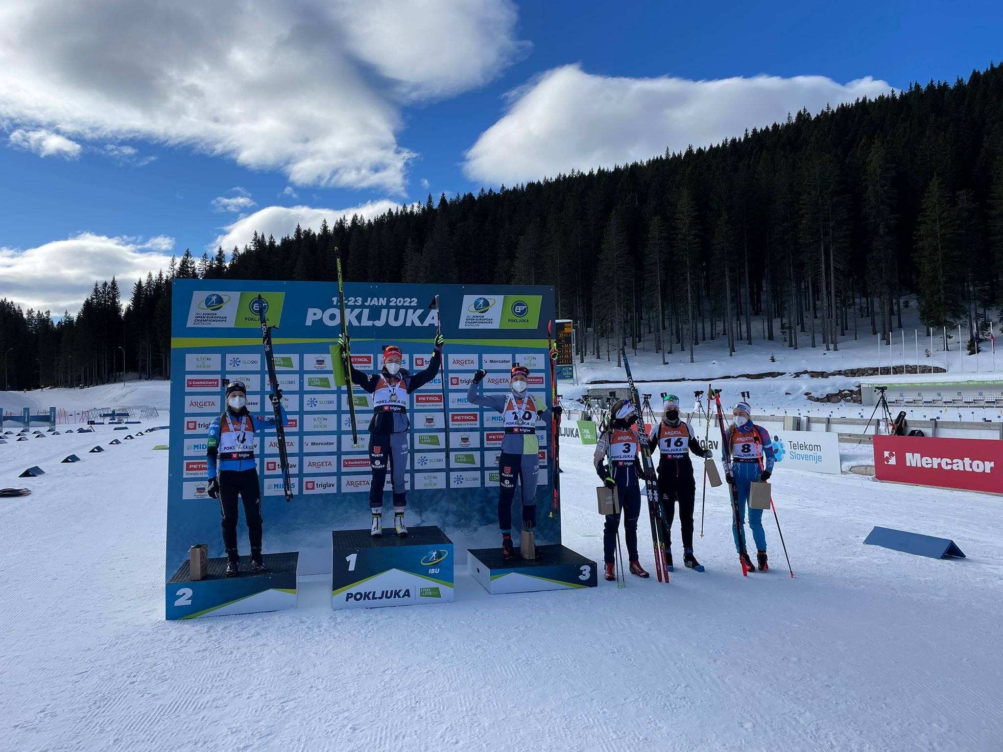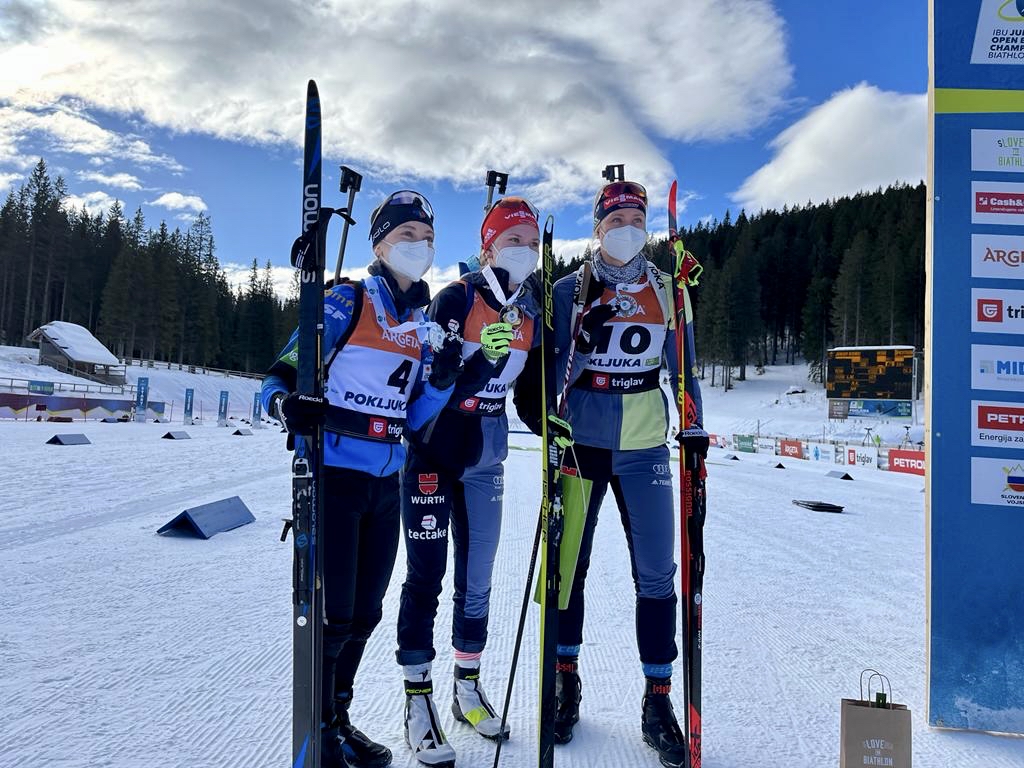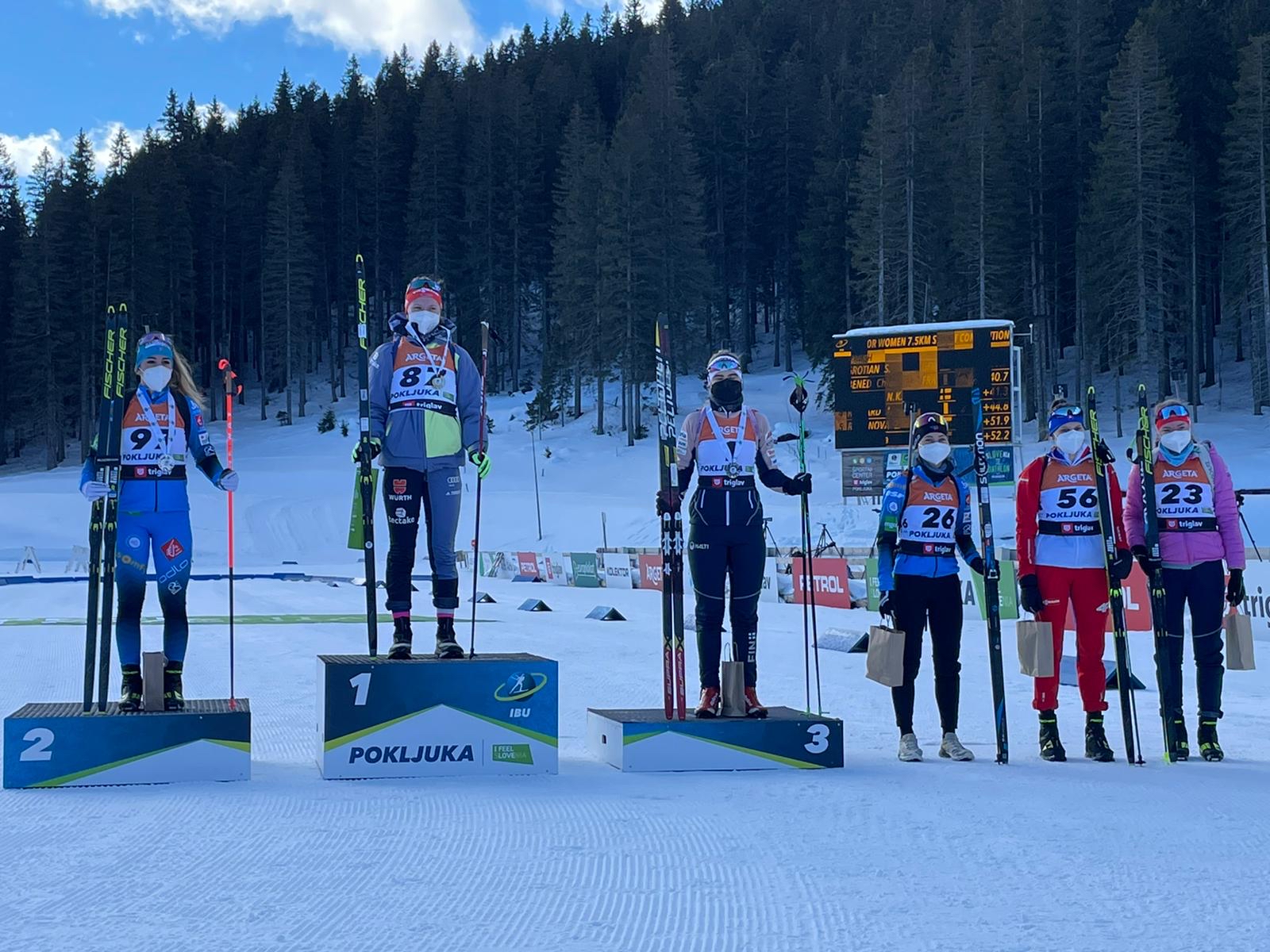 Wir gratulieren ganz herzlich zu dieser großartigen Leistung und freuen uns mit ihr über diesen Erfolg! Das Foto links zeigt sie übrigens in Nahaufnahme aus dem letzten Jahr, wo sie bei der WM in Obertilliach, Osttirol die Bronzemedaille gewonnen hat. Die Fotos unten stammen aus diesem Jahr und zeigen die Siegerehrung in Pokljuka, Slowenien.