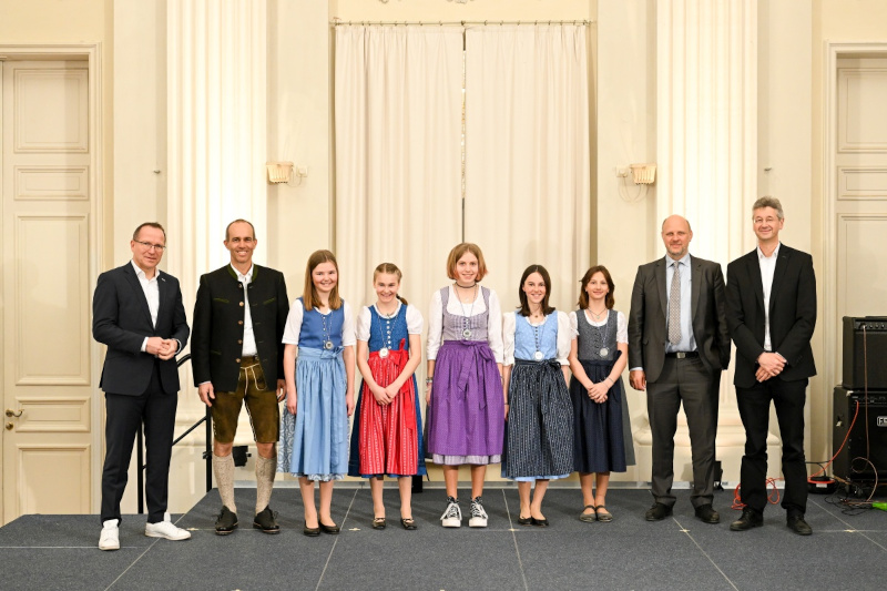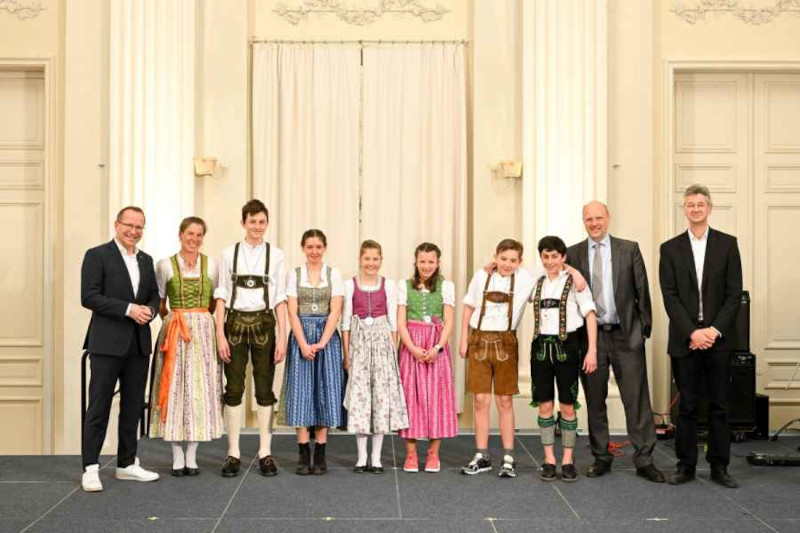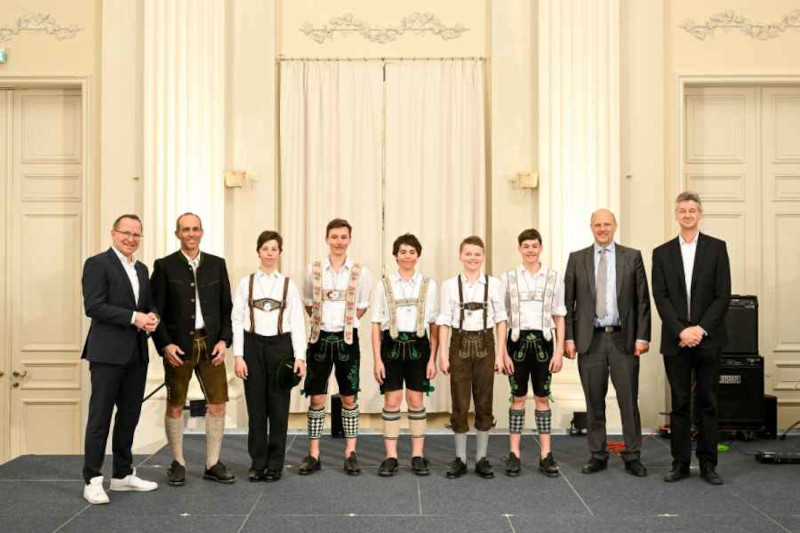 Als Anerkennung für die großartigen Erfolgen als beste Wintersportschule gratulierte unser Schulleiter und die ganze Schülerschaft vor dem Pavillon unseren erfolgreichen Langläufern und Skifahrern. Doch auch unser Kultusminister wollte seine Anerkennung persönlich ausdrücken. So lud er unsere Wintersportler, Betreuer und Herr Hagenauer zusammen mit den anderen bayerischen Sieger bei Jugend trainiert für Olympia aus allen Sportarten zu einem Staatsempfang in die Residenz in München ein. So wurde dem festlichen Anlass gemäß Rennanzug gegen Tracht getauscht und strahlend die Gratulation und vor allem das Büfett danach genossen. Ein tolles Erlebnis.