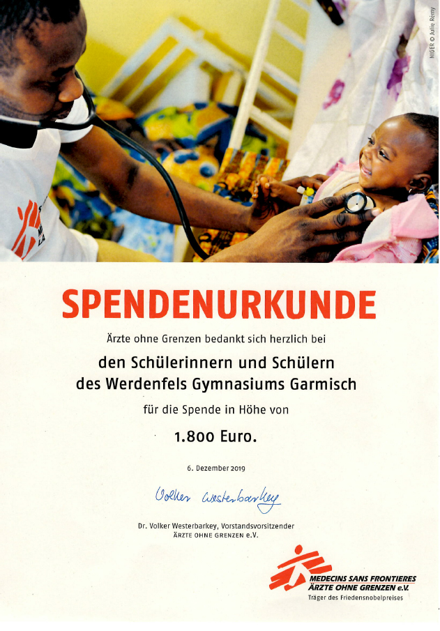 Vom Erlös des letztjährigen Weihnachtsmarkt konnten wir 1,800 € an „Ärzte ohne Grenzen“ überweisen. Allen, die dazu beigetragen haben und diese Spende ermöglicht haben, sei hiermit herzlich gedankt.